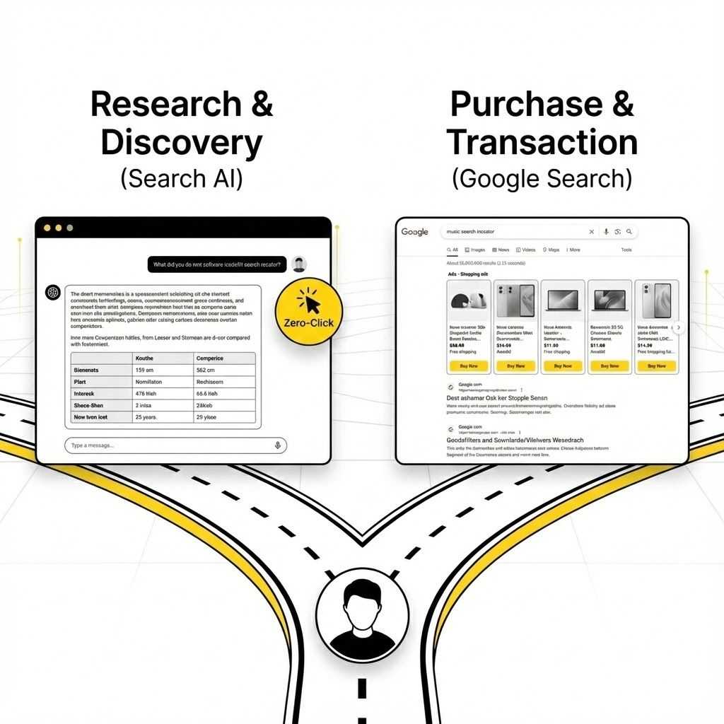 👉 efekt: faza badawcza przenosi się do AI, a faza zakupowa wraca do klasycznej wyszukiwarki Google. Jeśli Twoja witryna optymalizowana jest wyłącznie pod transakcję („kup teraz”), zostajesz pominięty przez AI w fazie doradczej. Jeśli z kolei inwestujesz tylko w bloga, a zaniedbujesz sklep – oddajesz klienta konkurencji w decydującym momencie.
