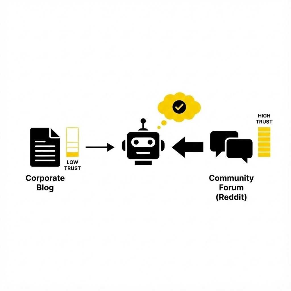 Modele językowe mają tendencję do „halucynowania” (zmyślania faktów). Aby temu zapobiec, algorytmy są zaprogramowane tak, by cytować tylko źródła o wysokim zaufaniu (E-E-A-T). To brakujące ogniwo w strategii wielu firm. Co istotne, AI coraz częściej ufa niezależnym dyskusjom (fora branżowe, Reddit, Quora), uznając je za bardziej autentyczne niż korporacyjne blogi.